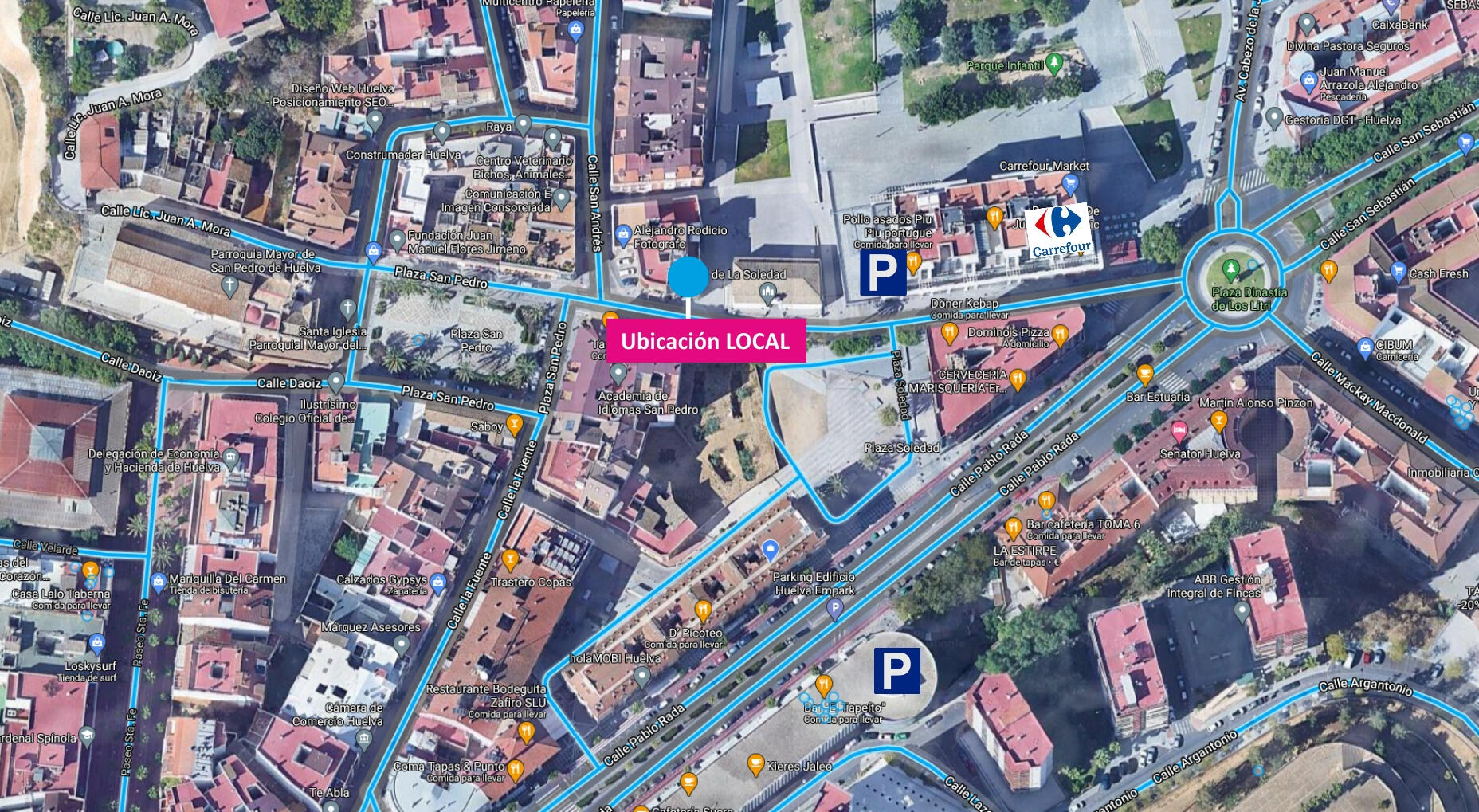 Cuenta con una privilegiada situación en el centro de Huelva.Su céntrica ubicación está rodeada de lugares de interés, e inmersa en la zona de restauración, comercio y ocio de la ciudad. Junto a la Ermita de la Soledad, a solo unos pasos nos encontramos la Plaza de San Pedro y Pablo Rada, con la más variada oferta de restauración de la ciudad.De fácil y rápido acceso, y al lado de dos parking públicos que facilitaran la visita de clientes, cuenta además con una excelente conexión al resto de la ciudad.